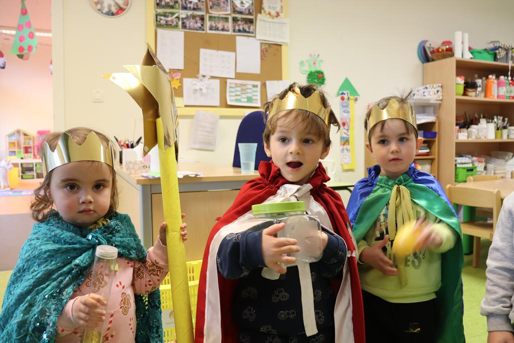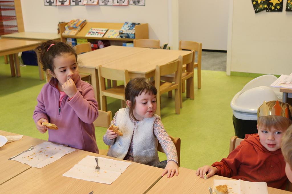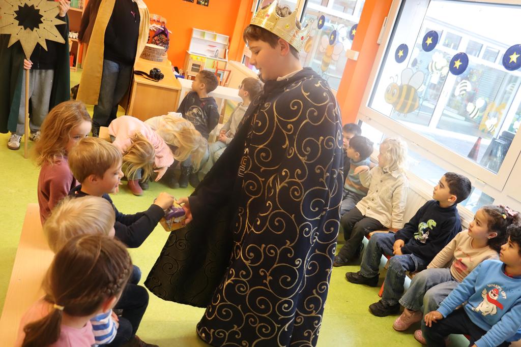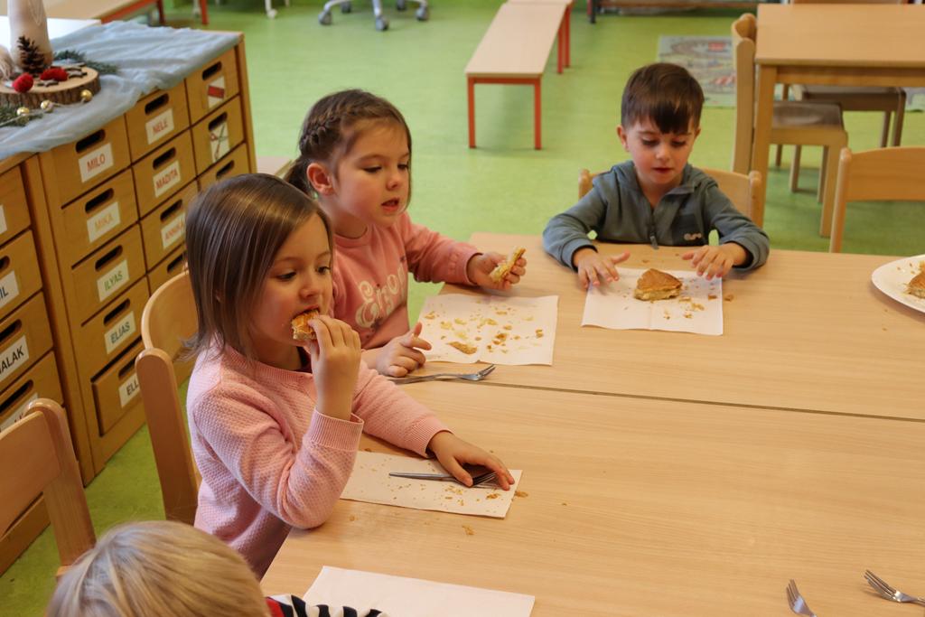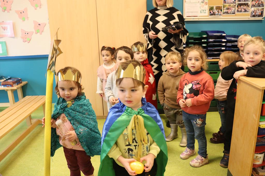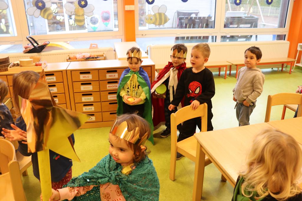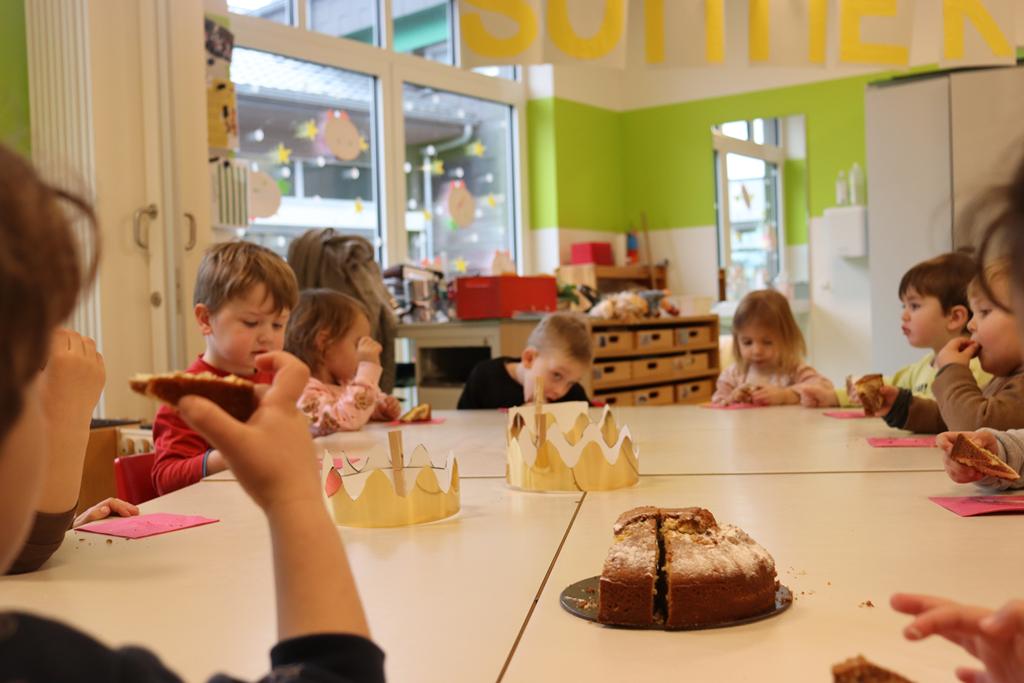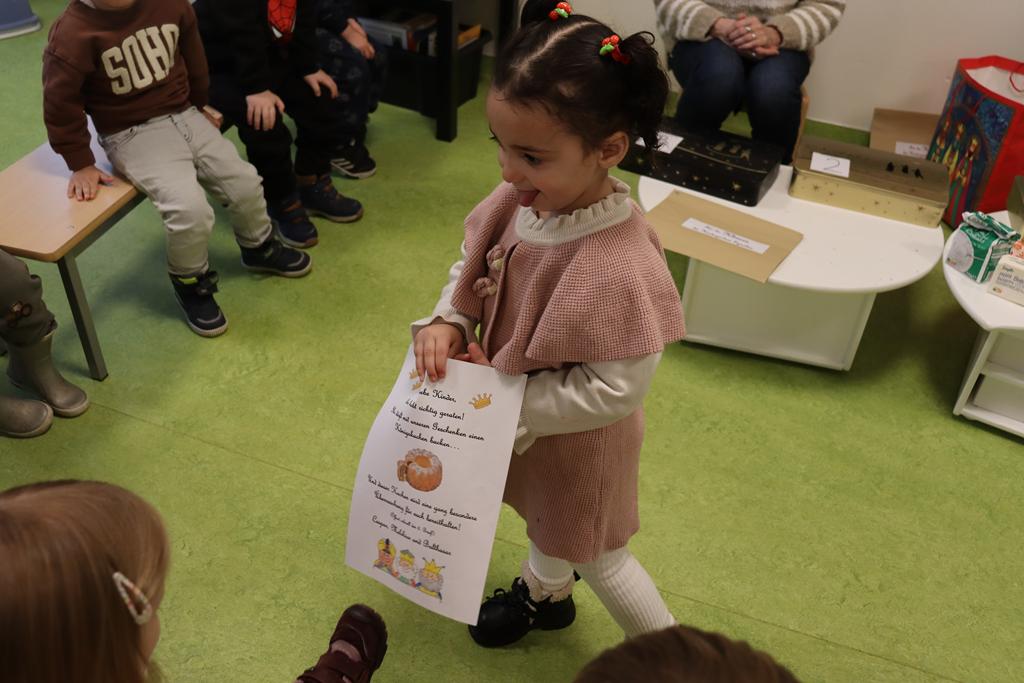 Ein Königskuchen wurde gebacken. Drei Kindergartenkinderkönige brachte der Königskuchen hervor, die mit dem Lied „Wir sind die Drei Könige aus dem Morgenland“ (von Kurt Mikula) eine Runde durch den Kindergarten drehten.