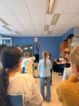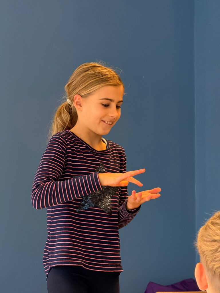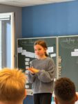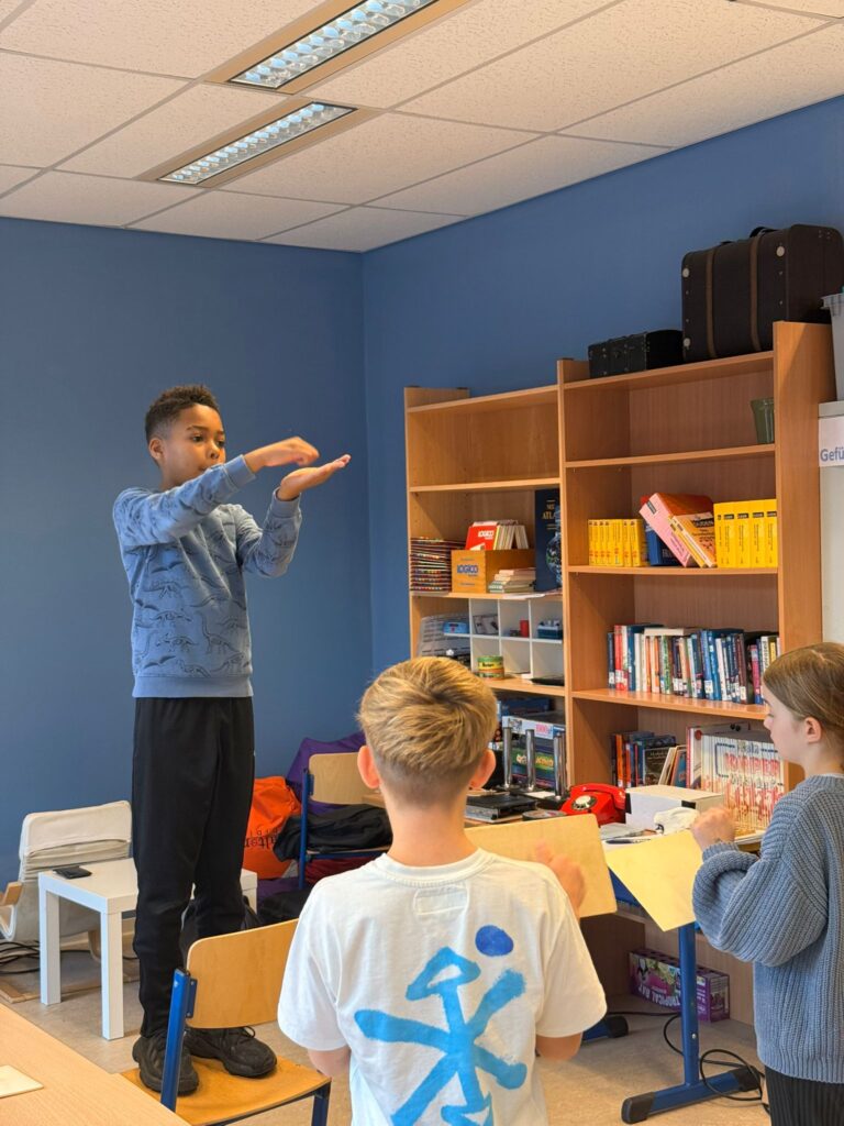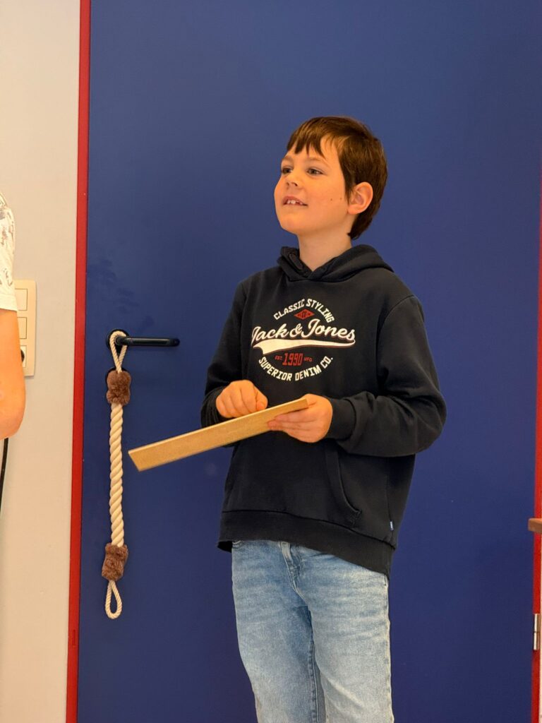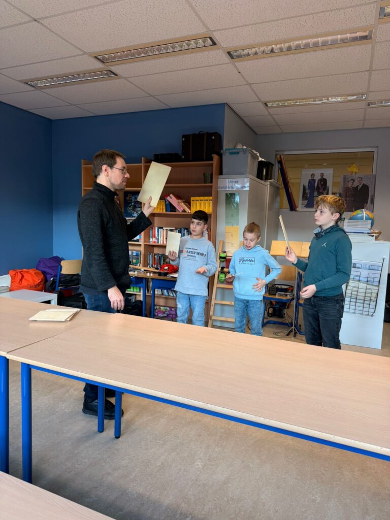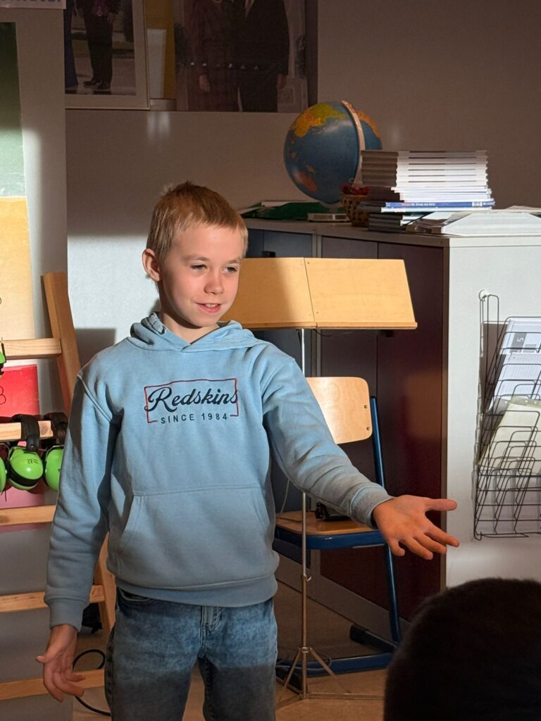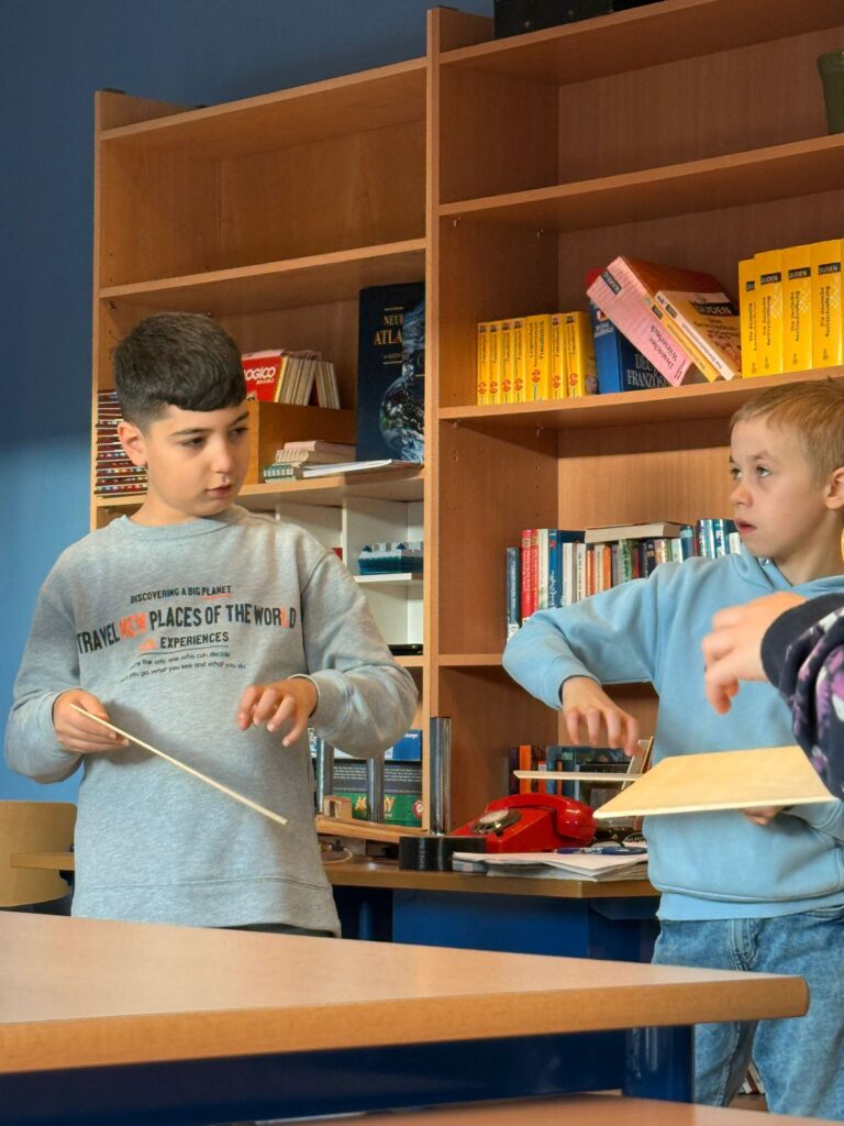 Zu Beginn lernten wir uns in einer Namensrunde kennen. Danach ging es auch schon los: Mit einer einfachen Holzplatte wurden die ersten Töne erzeugt – ganz ohne klassische Instrumente. Anschließend durften die Kinder sogar selbst in die Rolle des Dirigenten schlüpfen. Mit vorher abgesprochenen Handzeichen und Bewegungen gaben sie den Takt an und leiteten die Klasse – wie echte kleine Musikerinnen und Musiker.