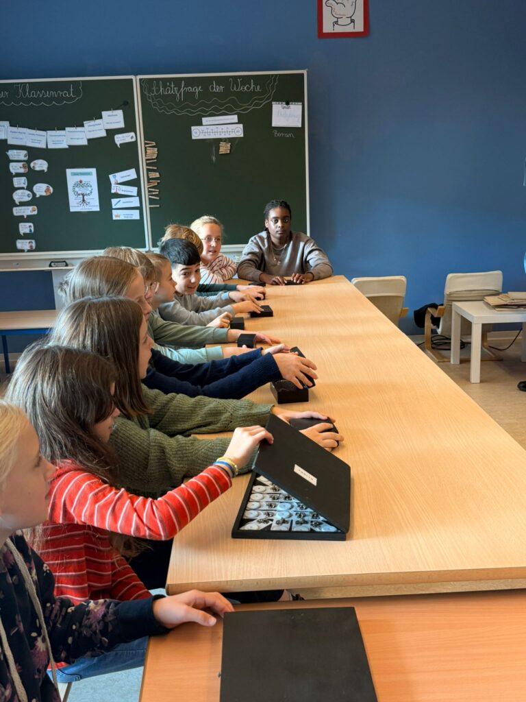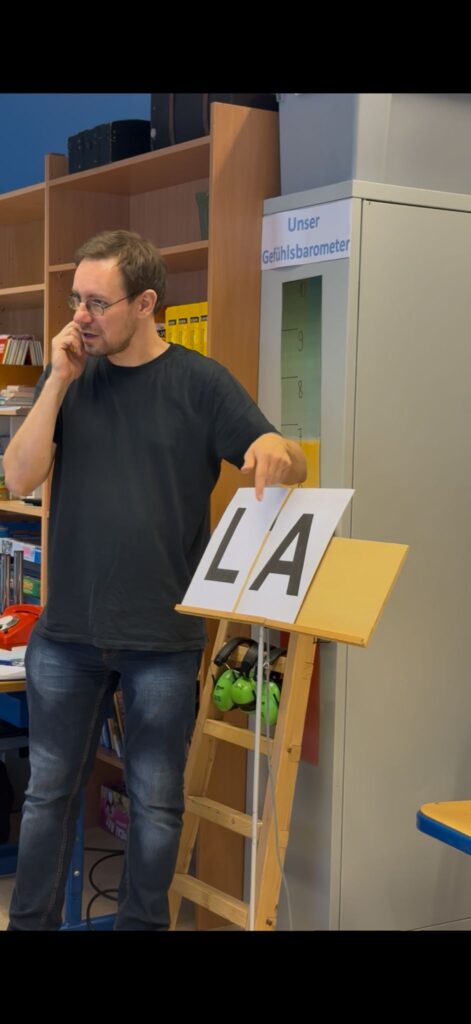 Im nächsten Teil experimentierten die Kinder mit sogenannten Klangkästen. Dabei entstanden spannende, teils völlig neue Geräusche. Danach wurde es besonders kreativ: Mit präparierten Buchstaben und einem Buchstabengerät ließen sich aus gesprochenen Lauten eigene Rhythmen und Melodien erzeugen. Sprache und Musik verschmolzen hier auf lustige Weise – manche Buchstaben klangen fast wie Trommeln oder elektronische Beats! Gemeinsam bildeten wir daraus kurze Wörter und komponierten sogar ein eigenes Buchstabenstück.