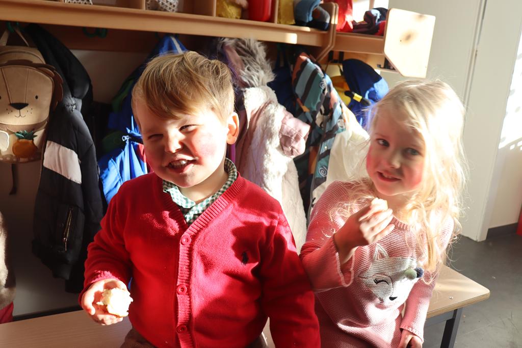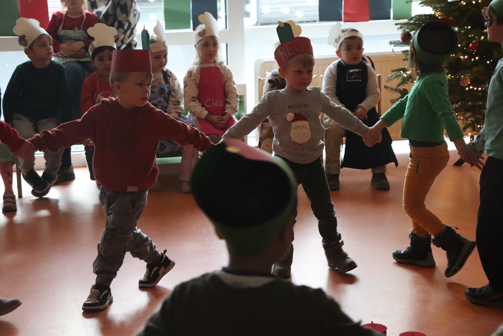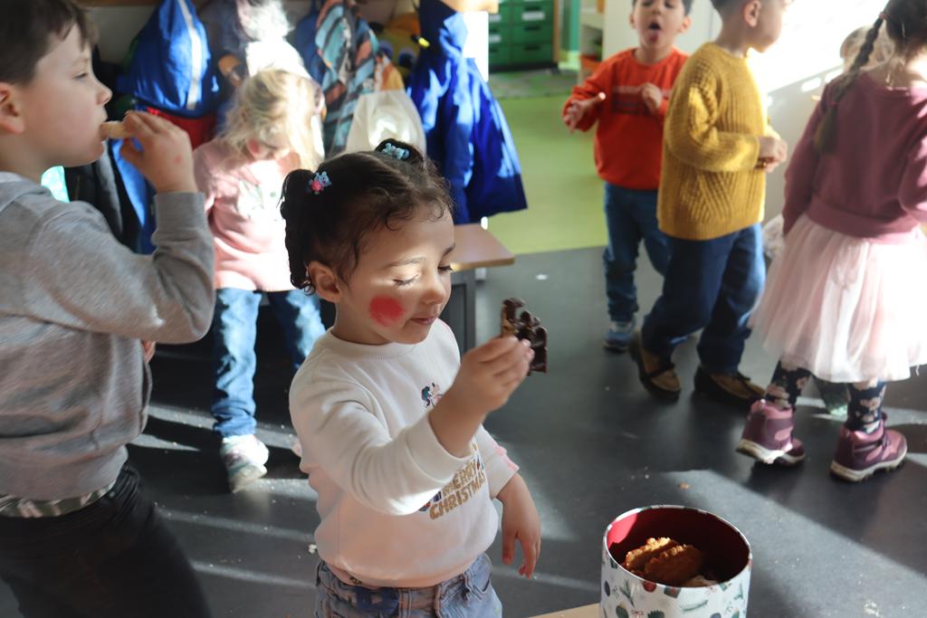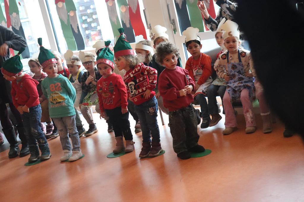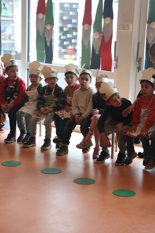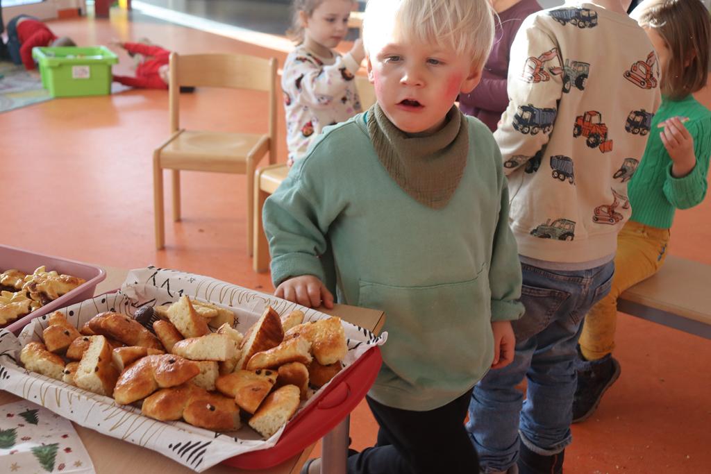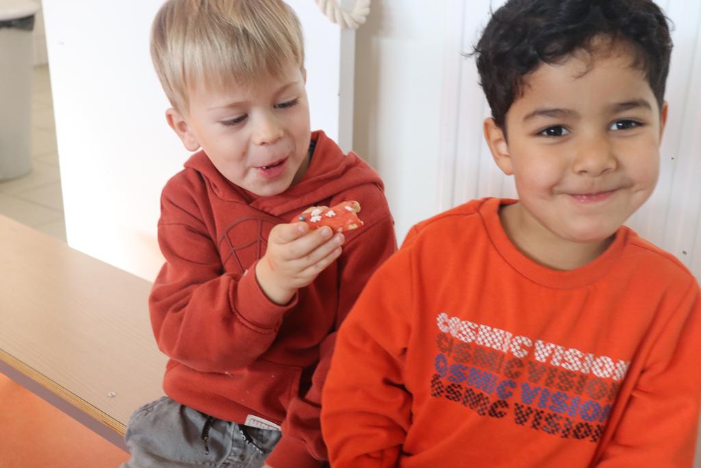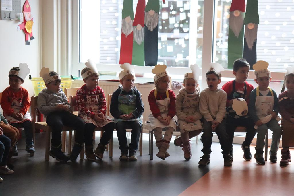 Die Kinder der zweiten Gruppe der Mittleren und Großen verwandelten die Spielhalle in eine riesengroße Backstube und zeigten, dass das Plätzchen- backen vor Weihnachten nicht fehlen darf.