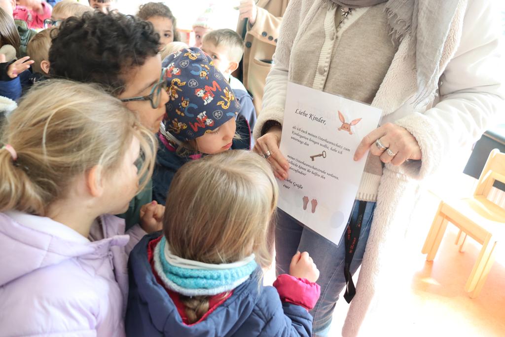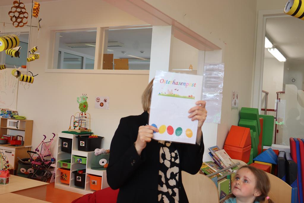 Nach einer erfolgreichen Ostereiersuche auf unserem Spielplatz durften wir uns, dank der Unterstützung aller Eltern, am reichhaltigen Frühstücksbuffet stärken. Und schon wieder entdeckten die Kinder Osterhasenpost!