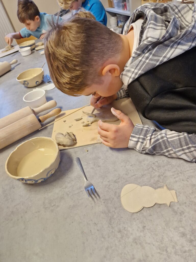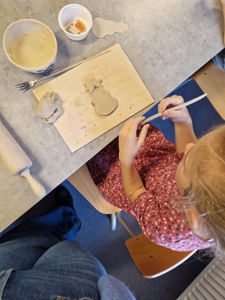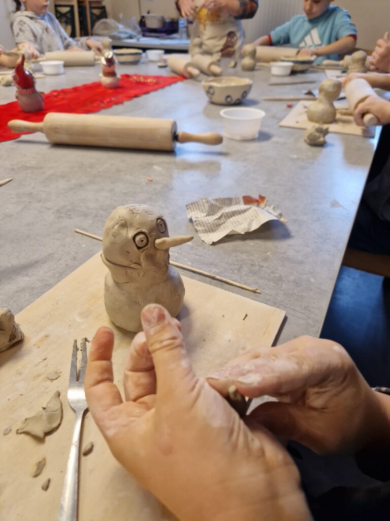 Anschließend ging es für uns selbst an den Ton: Wir konnten zwei eigene Schneemänner töpfern. Mit viel Freude, Kreativität und ein wenig Geduld entstanden tolle kleine Kunstwerke. Das Kneten, Formen und Verzieren hat uns allen richtig viel Spaß gemacht.