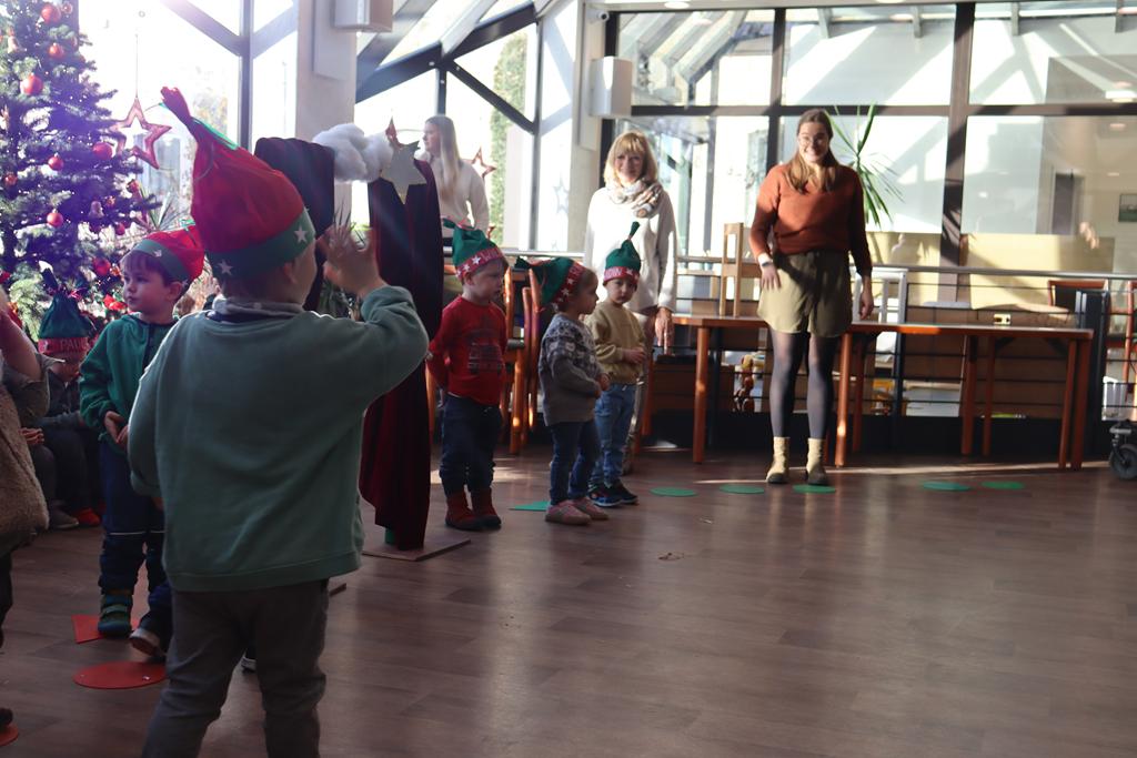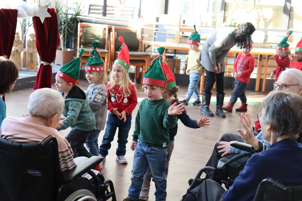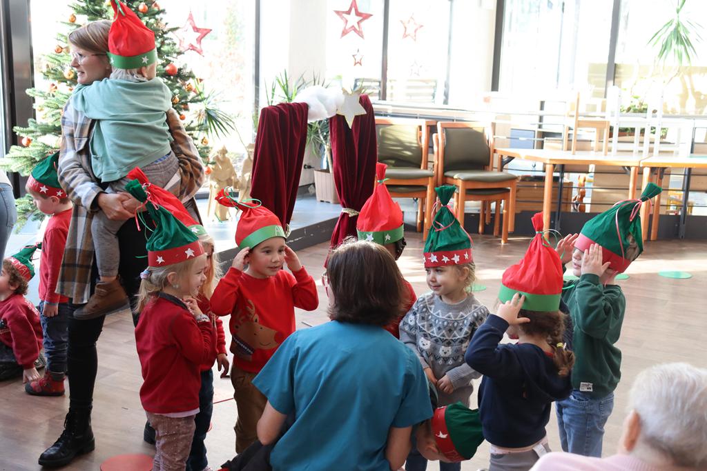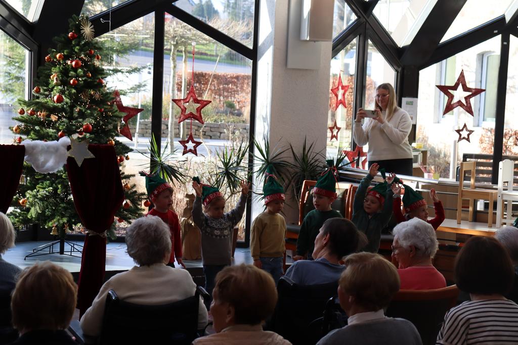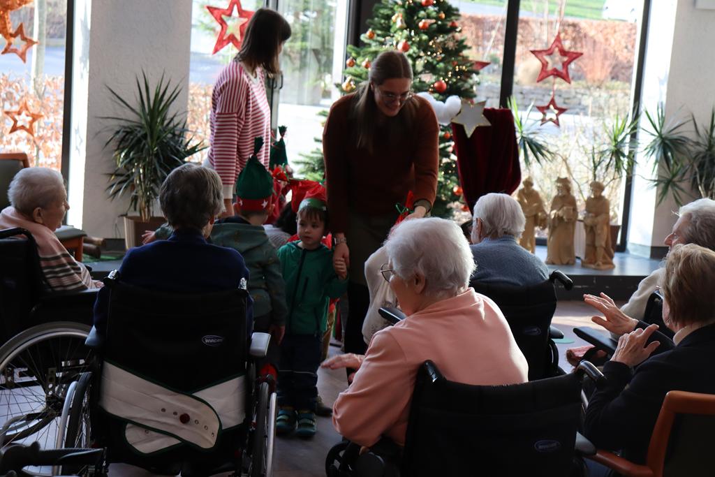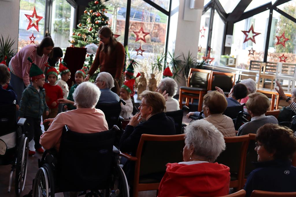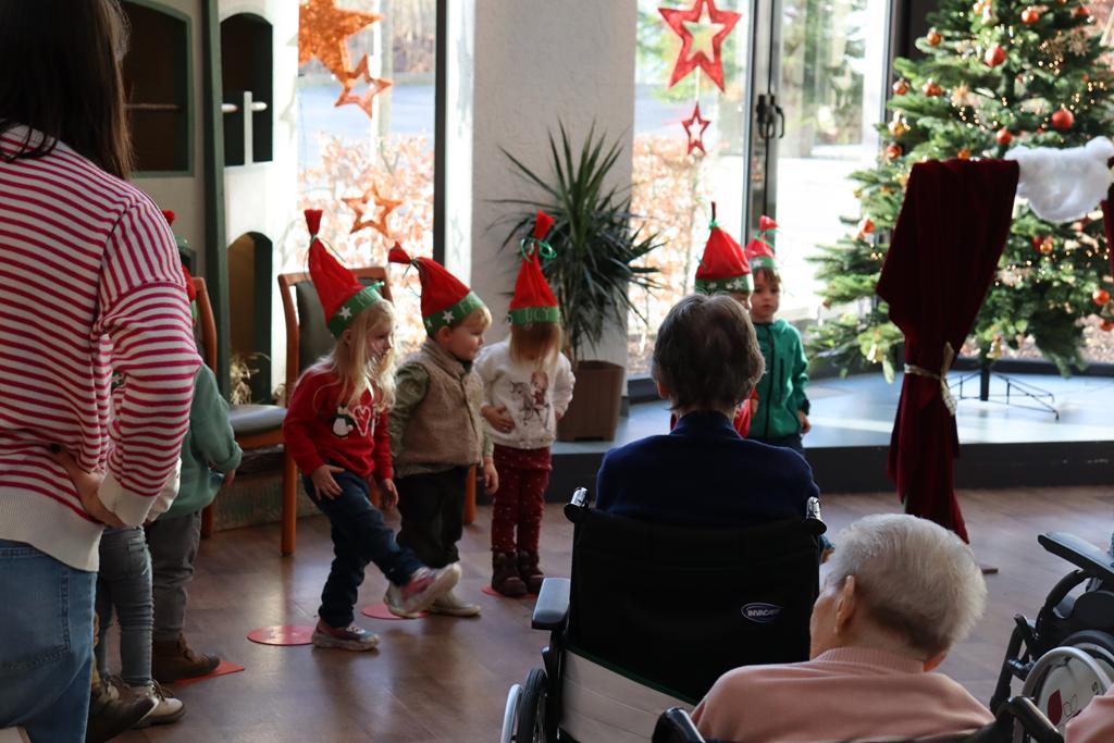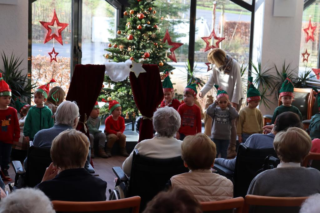 Zahlreiche Bewohner und Bewohnerinnen des Marienheims erwarteten uns im „Sonnengarten“. Schnell schlüpften unsere Kinder in ihre Kostüme und verwandelten sich in kleine Schauspieler. Die Weihnachtsgeschichte wurde aufgeführt und im Anschluss führten sie noch einen Weihnachtswichteltanz auf.