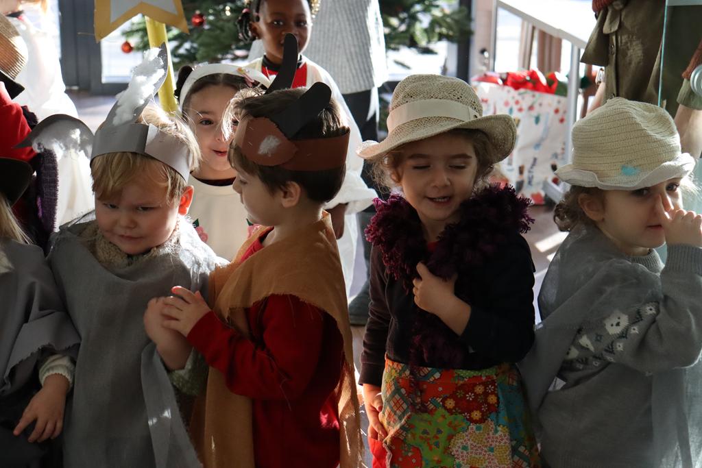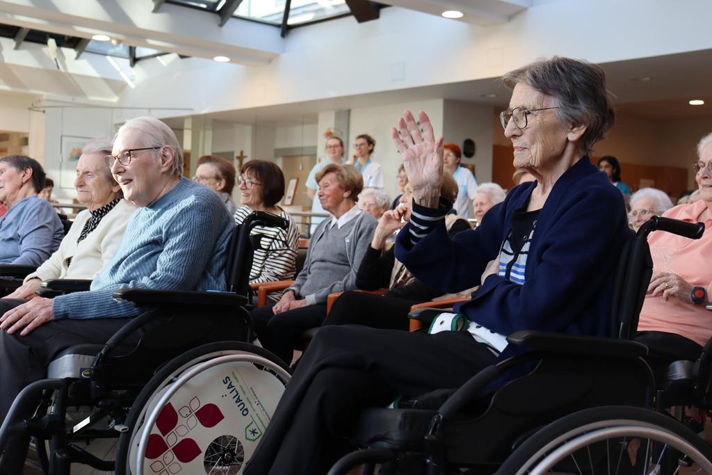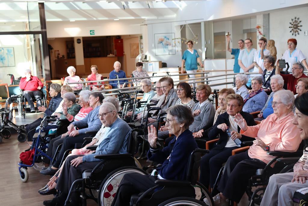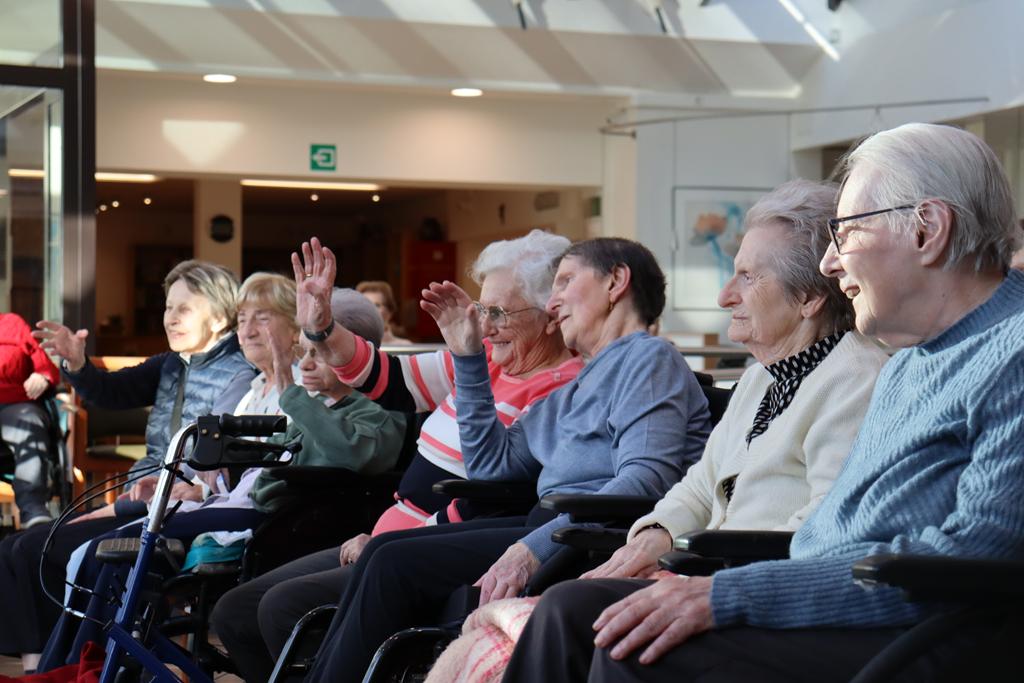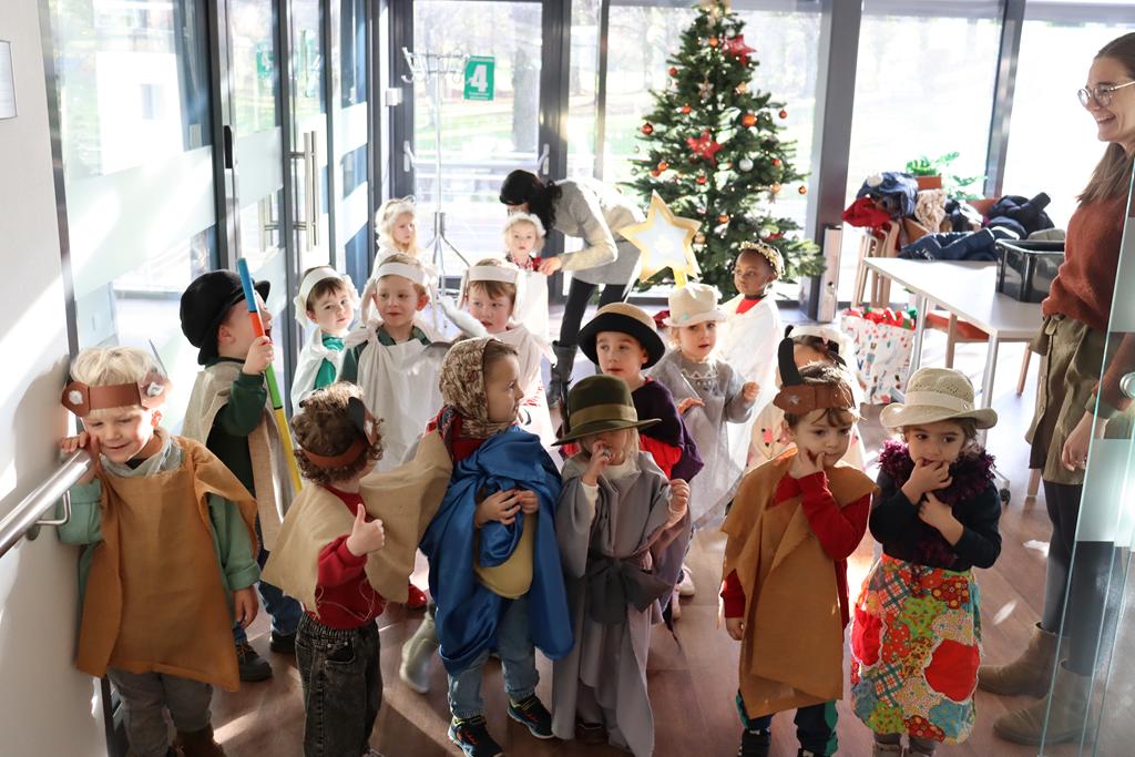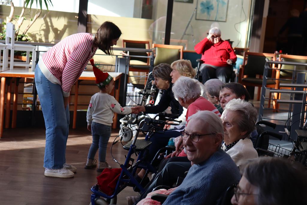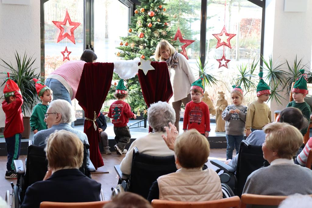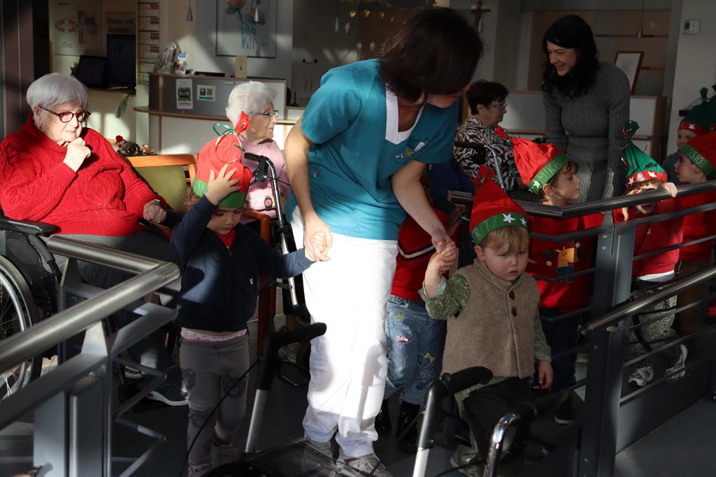 Zahlreiche Bewohner und Bewohnerinnen des Marienheims erwarteten uns im „Sonnengarten“. Schnell schlüpften unsere Kinder in ihre Kostüme und verwandelten sich in kleine Schauspieler. Die Weihnachtsgeschichte wurde aufgeführt und im Anschluss führten sie noch einen Weihnachtswichteltanz auf.